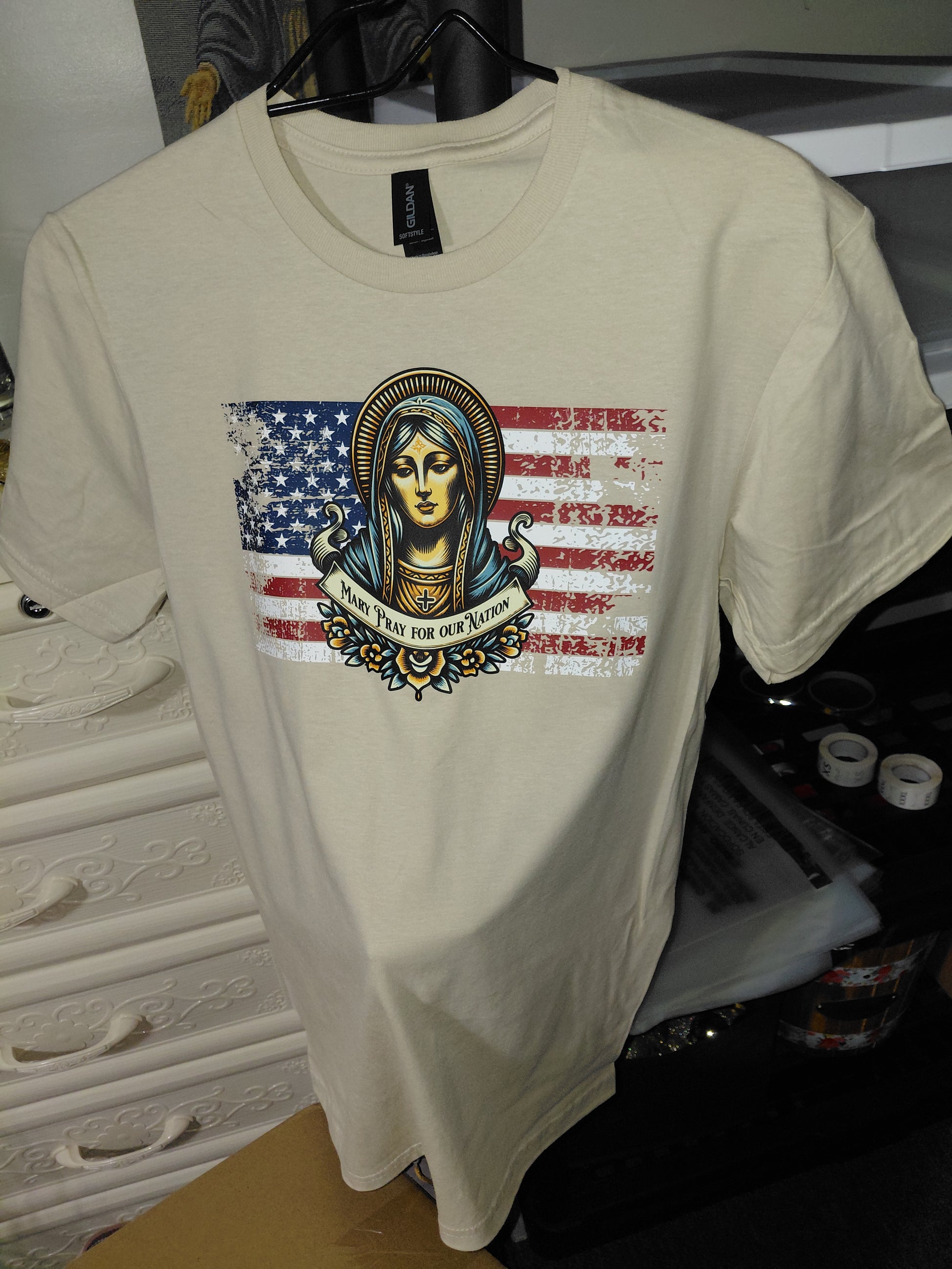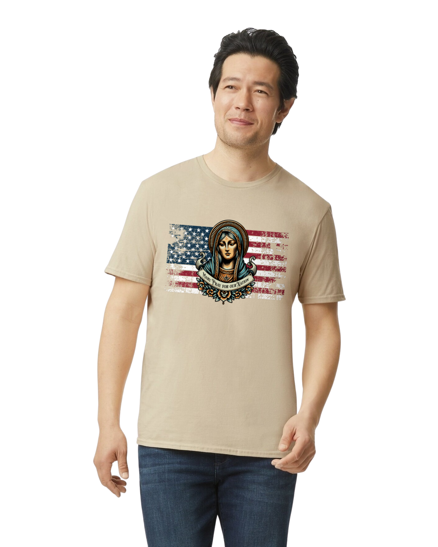 This is a soft style T-shirt, designed to ask our blessed mother for assistance.
